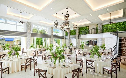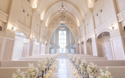 天井高10m、バージンロードの長さ20mにおよぶ開放感あふれる真っ白な大聖堂。誓いの言葉をのべるクライマックスシーンにはダウンライトになり、ロマンチックな天使の羽根が舞い降りる「エンジェルシャワー」も人気です。挙式後は、青空のもとふたりで大階段をおりながら大勢のゲストの祝福を浴びて!フラワーシャワーやブーケトスなど広いガーデンでゲストとお愉しみいただけます。
