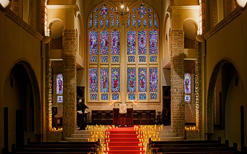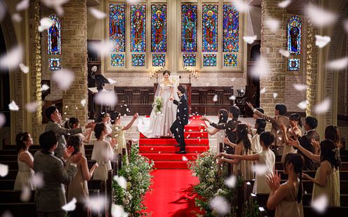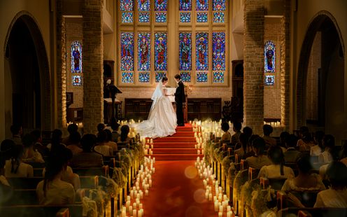 海の上に建つクラシカルな本格的大聖堂。30mのロイヤルレッドのバージンロードの先にある、15mの壮麗なコバルトブルーのステンドグラスや木扉、長椅子などの調度品は200年の時を刻み、英国リバプール教会から譲り受けたアンティーク品です。生演奏の調べに包まれながら厳かな雰囲気の中でふたりの永遠の約束を交わしてください。