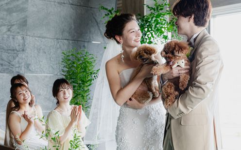 大聖堂や3つのパーティ会場に囲まれたアイランドの中心にあるラグーンの水音が心地よい「アクアコート」ではふたりらしい多彩な演出をお愉しみいただけます。ガーデン挙式をはじめ、スイーツビュッフェなど演出は自由自在!また、青空の下、福岡タワーをバックに記念撮影もおすすめです。家族の一員であるペットにも参列いただけます。