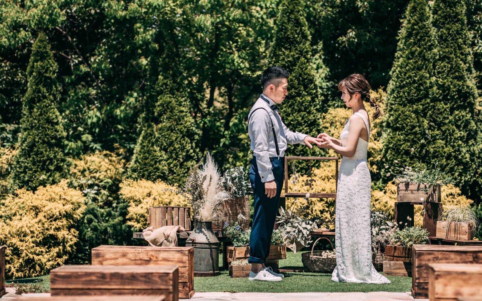 ガーデン挙式ならではの温かな雰囲気で、おふたりだけでなくゲストの方からも自然な笑顔がこぼれます。そして、大自然の中での誓いは忘れられない記憶に。森の中らしくリングピローも切株をオシャレにアレンジしたり、オーダーメイドの誓約書で一生の宝物に。