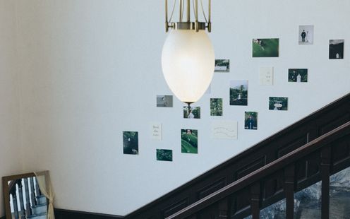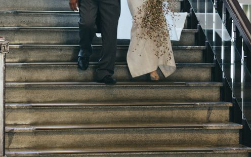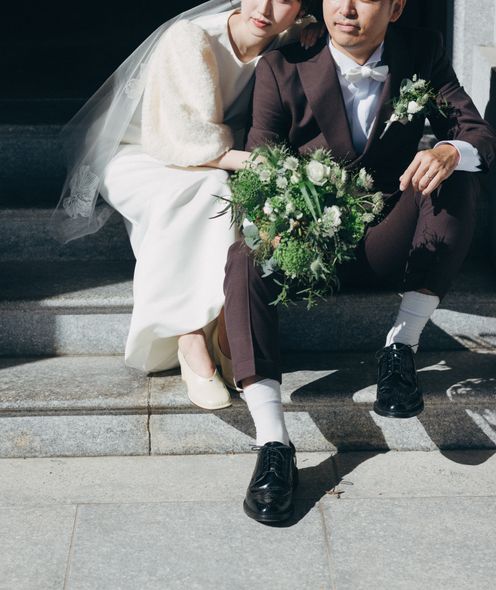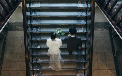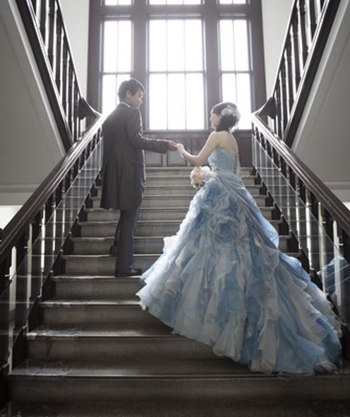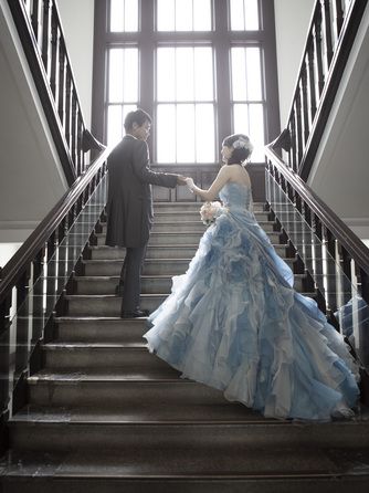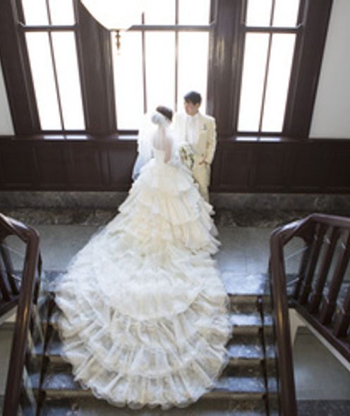 重厚感漂う木の手すりや、ゆるやかに広がるドレスのトレーン、自然光が織りなす陰影がまるで映画のワンシーンのよう。