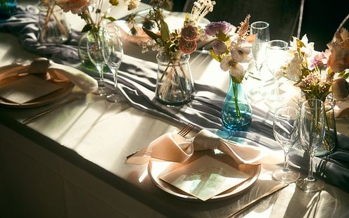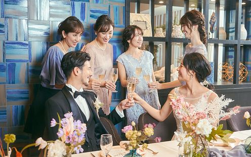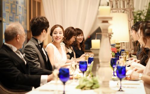 ひとつのテーブルを囲み食事と会話を楽しむ会食スタイルもお任せください。象徴的な青い壁をバックにしたレイアウトも人気です。新郎新婦とゲストはもちろん、ゲスト同士の会話も弾むアットホームな空間作りをお手伝いします。