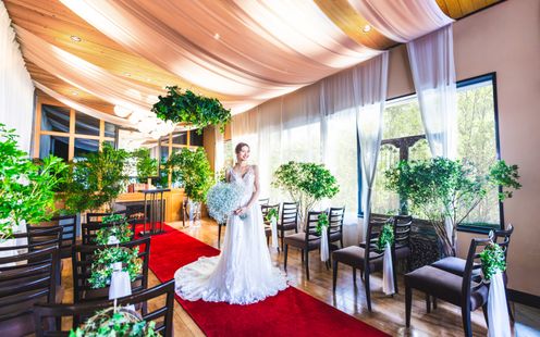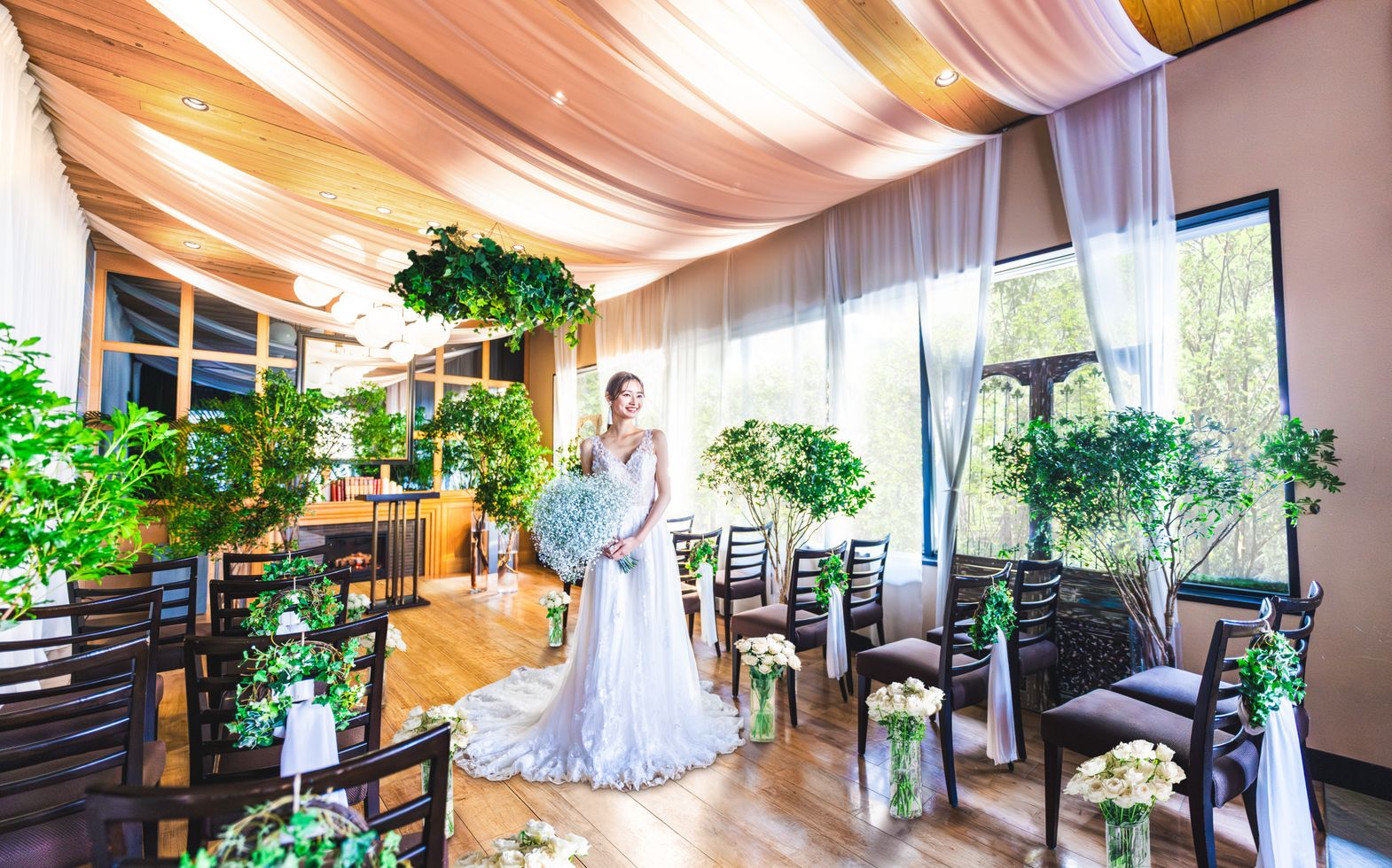 木の温もりと自然光に包まれるアットホームな空間。グリーンナチュラル系の装飾は、自然と心が癒されます。ドライフラワーを取り入れてアンティークな雰囲気にもチェンジOK。持込フリーなので思い出の品やお気に入りアイテムを好きな場所に飾ったり、テーマを決めてふたりだけの世界観を創り上げてください。ゲストとの距離感もちょうどよく、あたたかな挙式をお迎えいただけます。