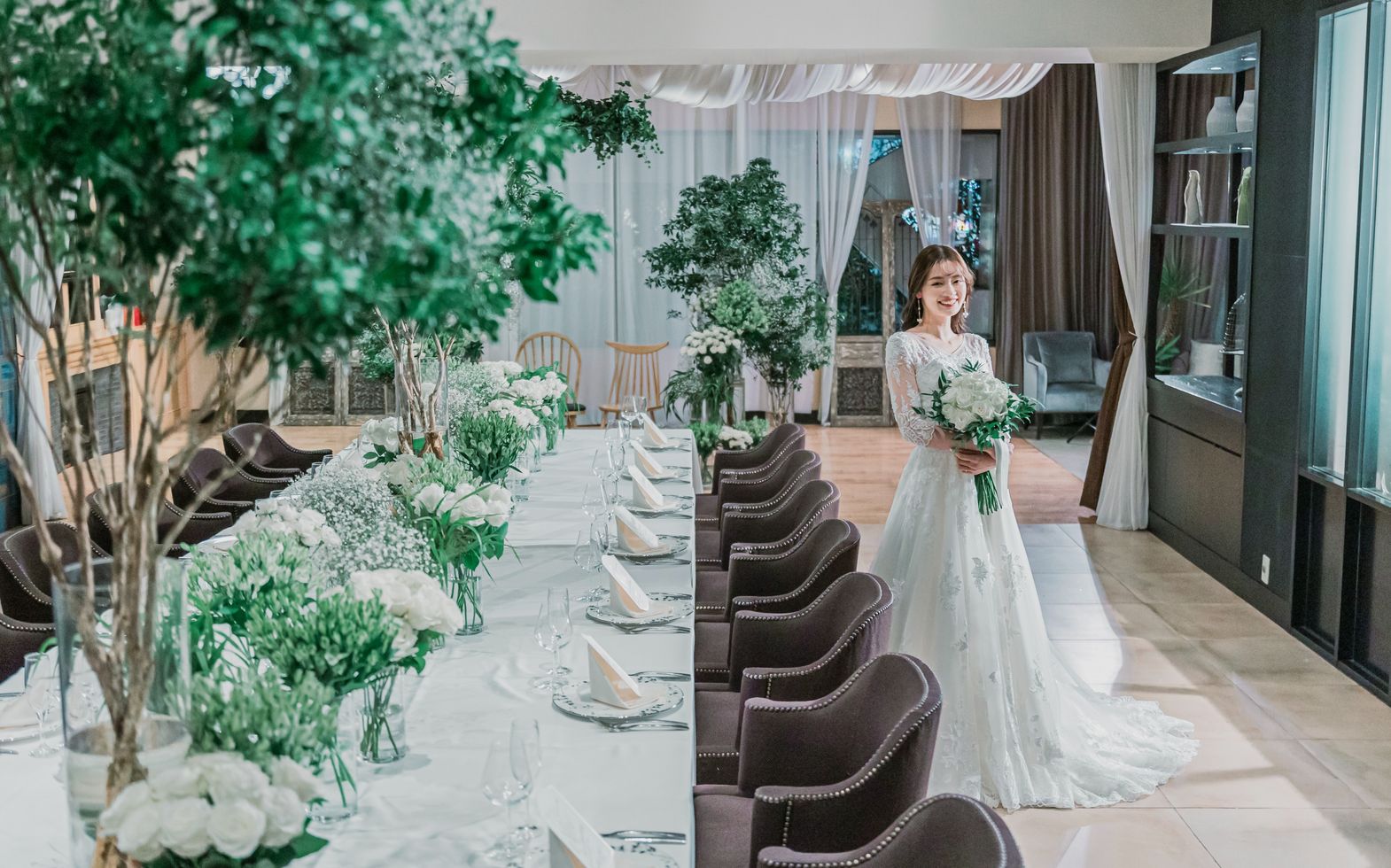 ひとつのテーブルを囲んでお食事を楽しむスタイルや長いテーブルを並べた晩餐会スタイルまで、レイアウトのバリエーションは様々。家族の食事会、友人との1.5次会(会費婚)等、それぞれのイメージに寄り添った会場作りにこだわります。フローリストとのお打ち合わせで会場内のお花や装飾も自由自在。青壁をバックにしたメインはグリーンナチュラル系、アンティーク系どんなコーディネートもお洒落に決まります。