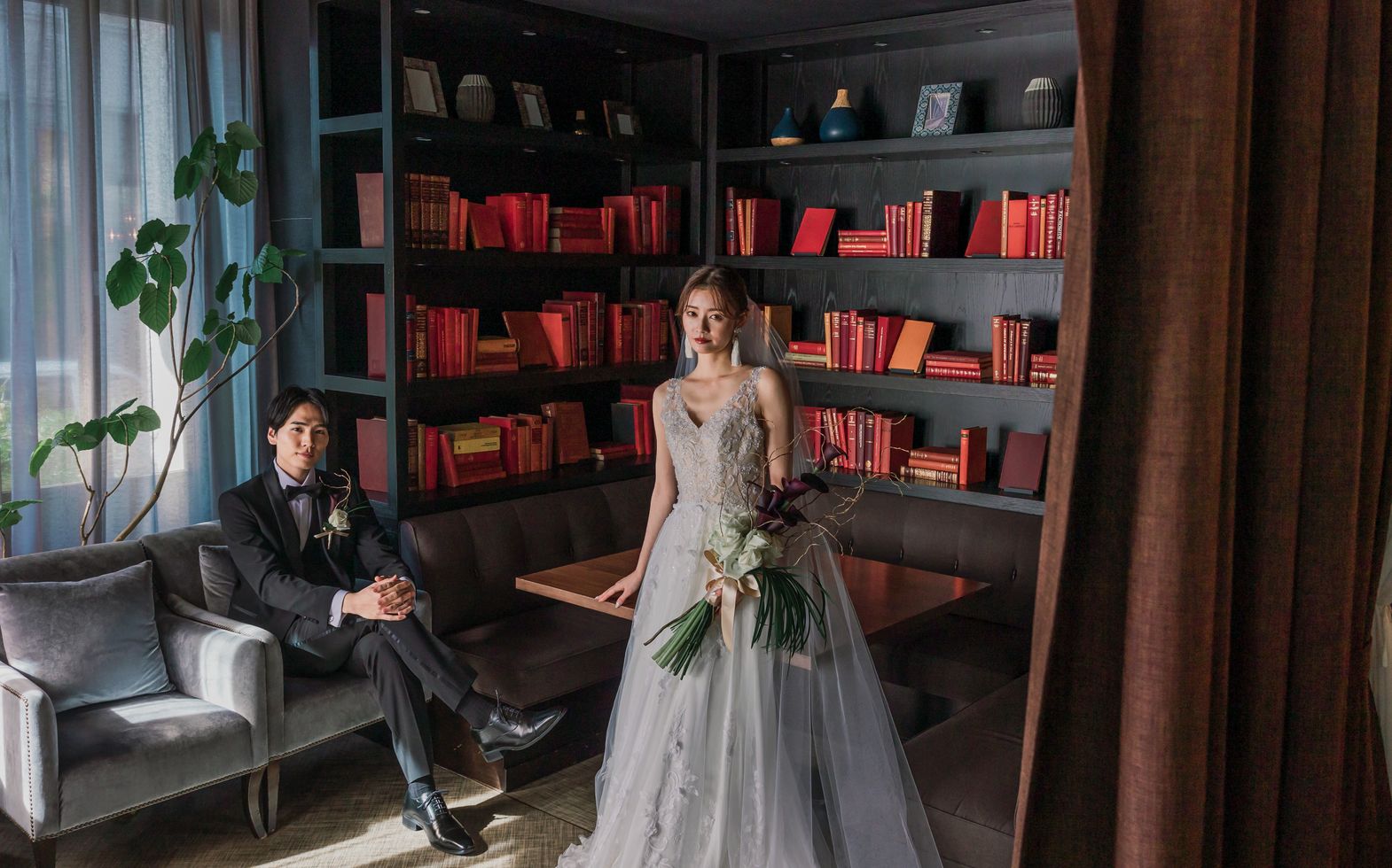 「1/fのゆらぎ」がコンセプトの空間。中でもライブライリーはゆったりと落ち着くスペースのひとつ。記念日にレストランでの食事を楽しんだり、挙式前にふたりだけの時間を過ごしたり、フォトスポットとしても人気です。