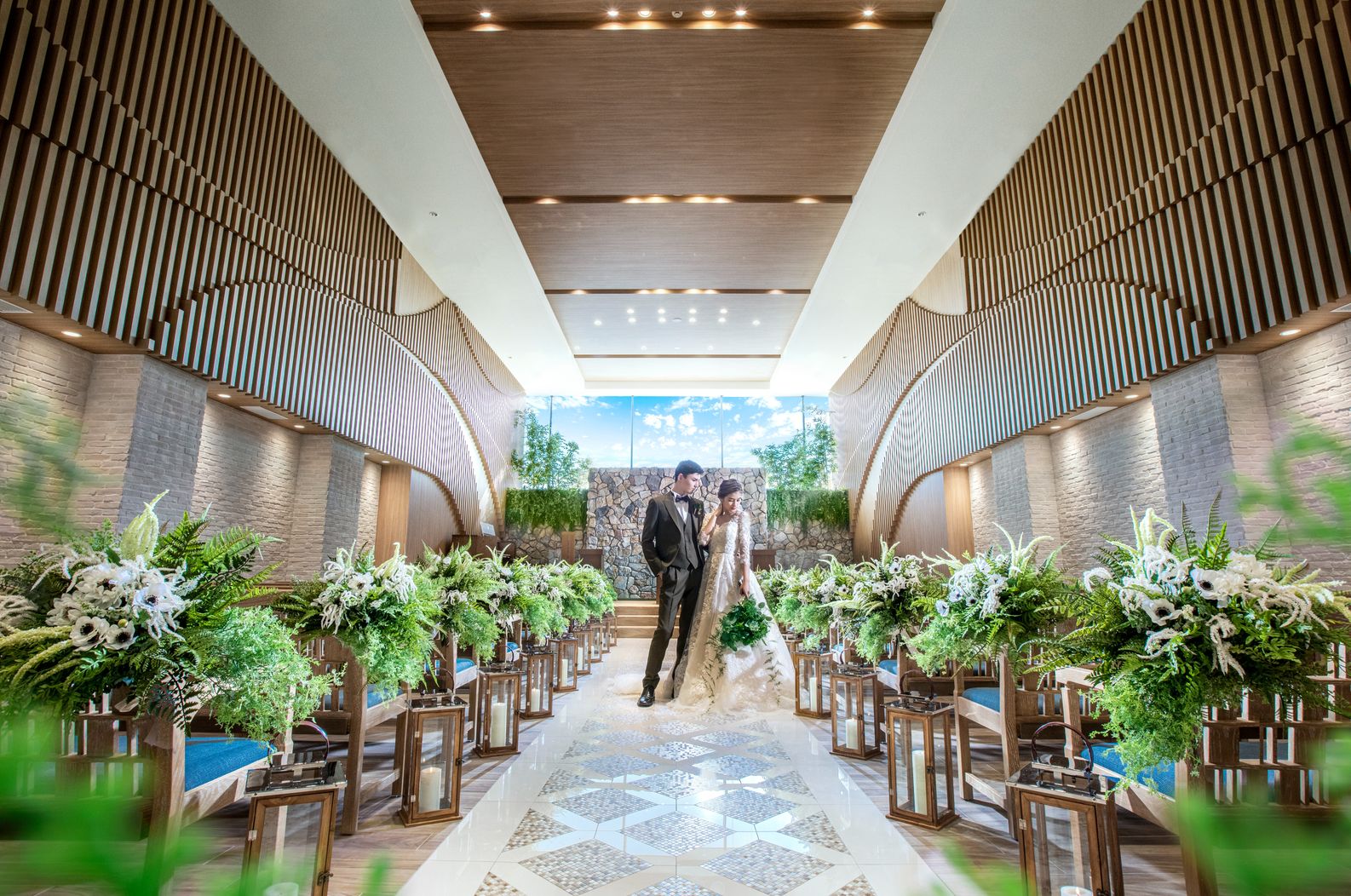 02.【光・木・石】が彩る温かみあふれるモダンチャペル。式後は青空の下でアフターセレモニー