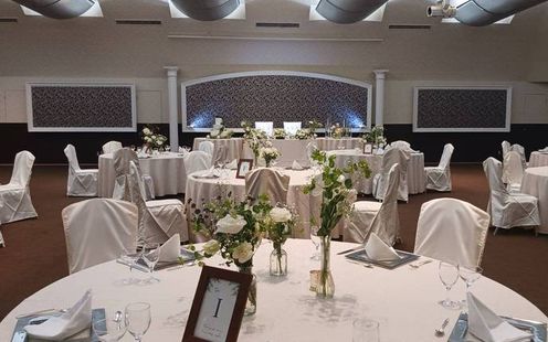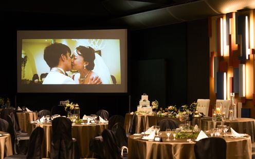 絵画のような壁面のフレームが印象的!白を基調とした明るく開放的なパーティ会場