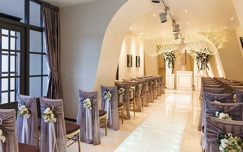 ブルーの床とシルバーの壁面が海をイメージさせる会場。少人数での結婚式にぴったりです。