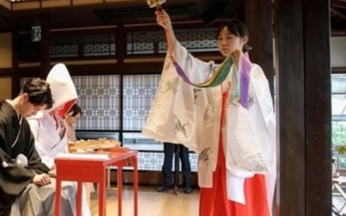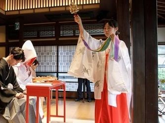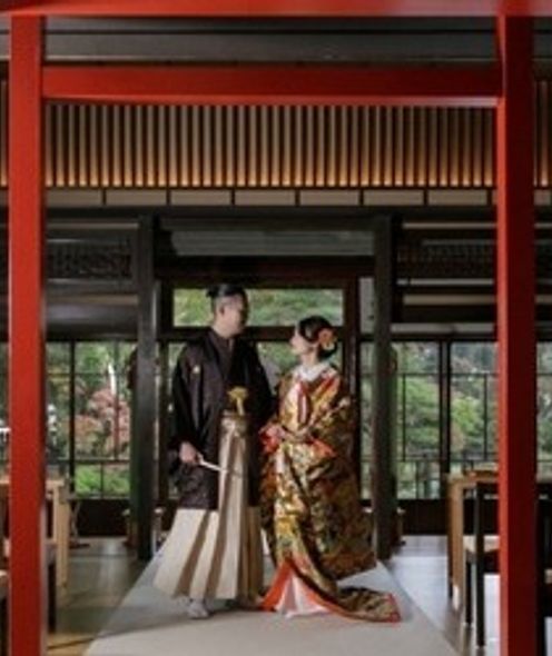 朱赤が鮮やかな神殿で、古式ゆかしい挙式を。両家の絆を結ぶ館内神前式