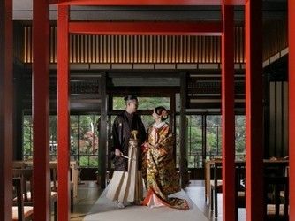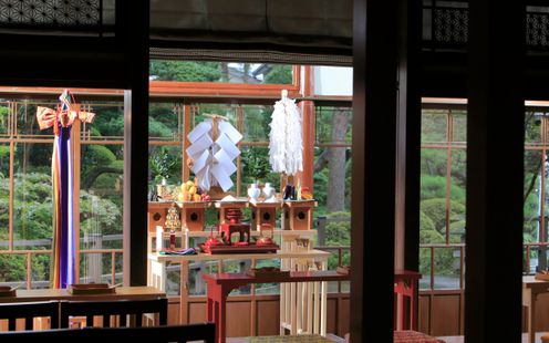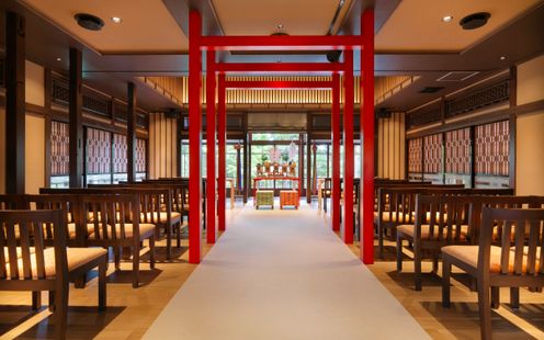 随所に和を感じる細工がほどこされたモダンな神殿は、鳥居を思わせる朱赤のあしらいが特徴的。太鼓、笛、鈴の音色が響き合う雅楽の演奏や、近隣神社の宮司による古式ゆかしい神前式が執り行われます。白無垢や色打掛、黒引振袖も映える空間。