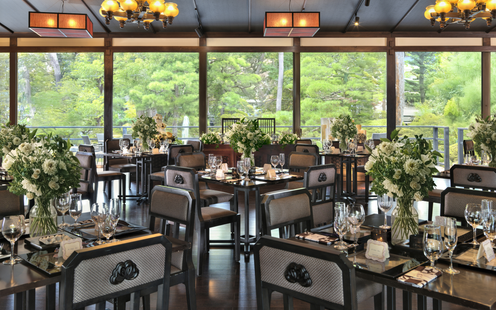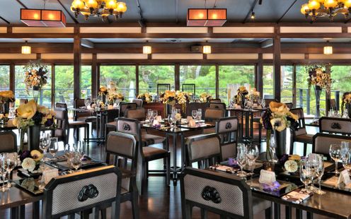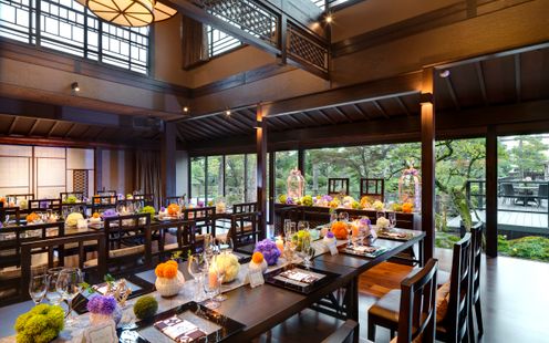広大な日本庭園を望む、天井が高い開放感溢れるパーティ会場をふたりらしくコーディネート。1組貸切のため、エントランスからオープンテラスまでトータルでおもてなし空間を創り上げます。和モダンにも、キュートな雰囲気、ナチュラルテイストなどふたりの憧れのスタイルを実現します。