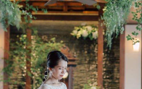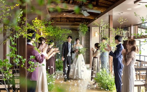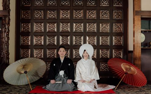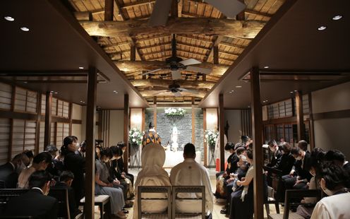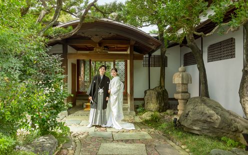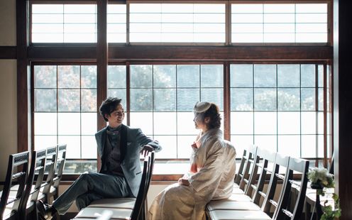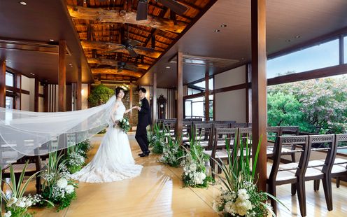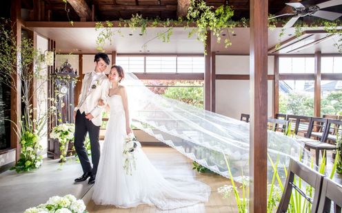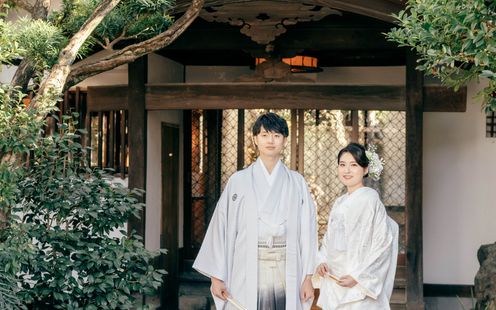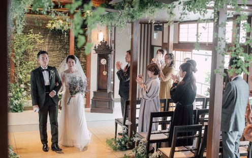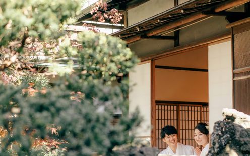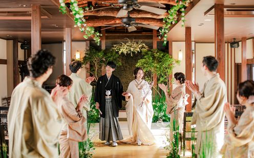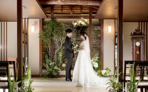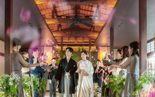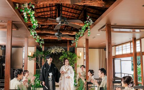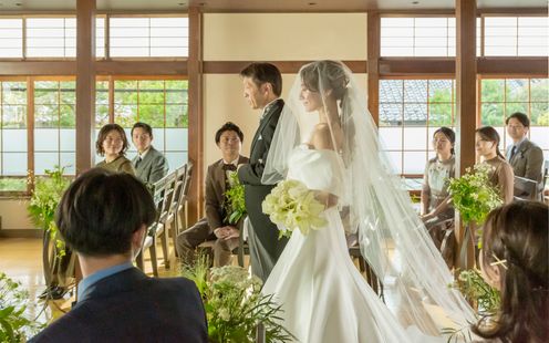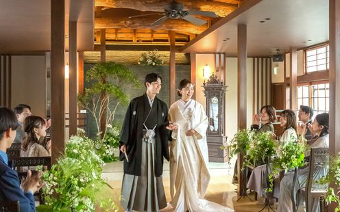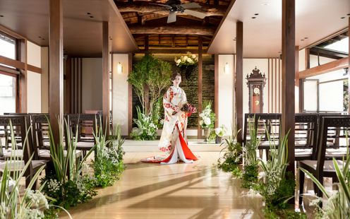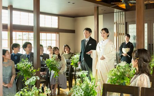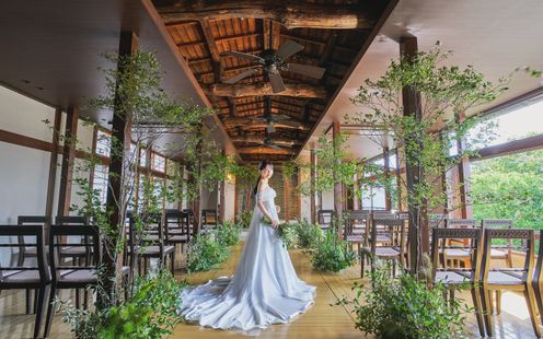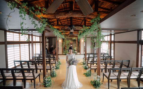 木の温もりを感じる柱や天井の梁は157年の時を刻む建築当時のままの美しさ。四季折々の自然の息吹を感じる日本庭園を望み、自然光に包まれながらゲストと距離の近いアットホームなセレモニーが叶います。挙式スタイルは「ハツネヤガーデン」オリジナルの挙式"刻乃式"をはじめ、ふたりらしい言葉を綴る人前式、キリスト教式、神前式からお選びいただけます。