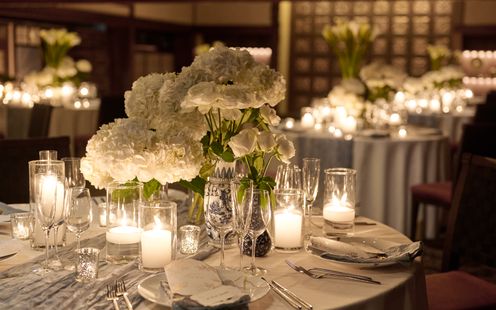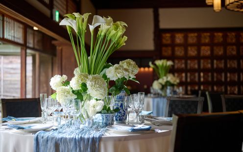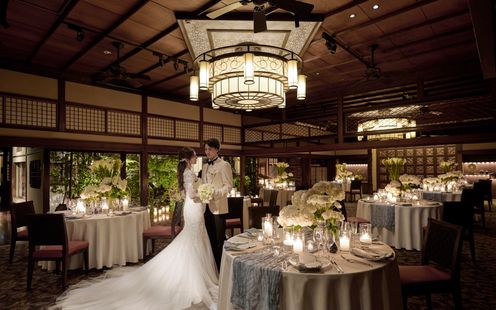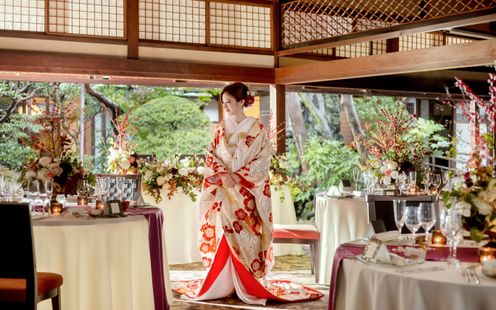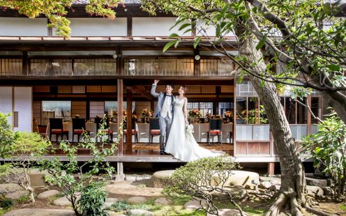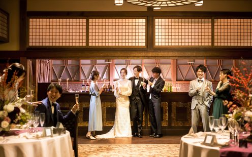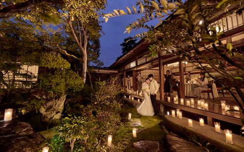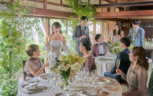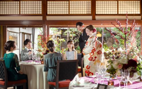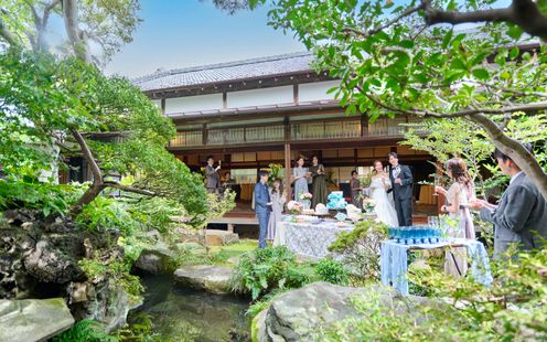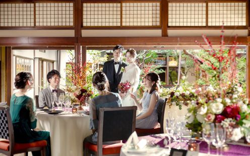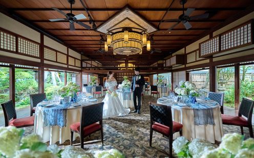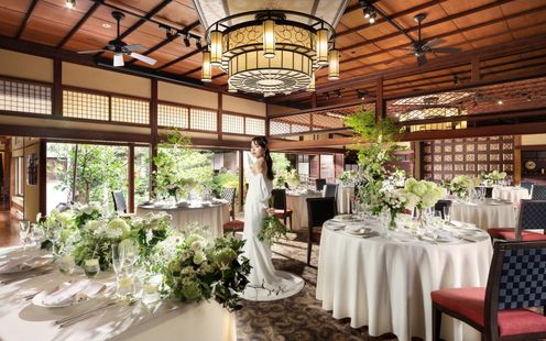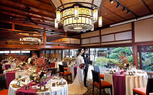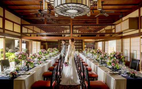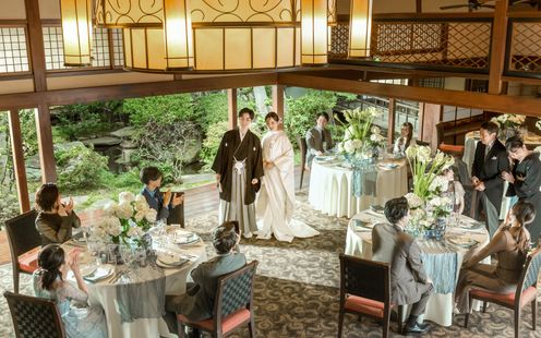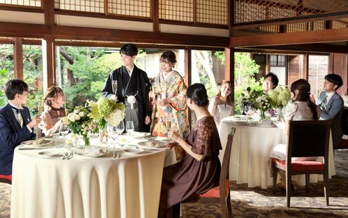 歴史の奥深さを物語る意匠を凝らした建築美が髄所に光る100畳もの大広間。良縁を祝福する“円”をモチーフにしたシャンデリアも印象的なメインダイニングでパーティが繰り広げられます。バーカウンターをはじめ、空間も中庭も自由に使ったおもてなしが可能。中庭での記念撮影や、コース料理は大広間で楽しみ、デザートはラウンジへと移動してゲストと歓談するなど、ふたりらしい演出・進行を提案します。樹齢100年以上の木々が茂る美しい庭園を愛でながら、大切な人たちと寛ぎ溢れるひとときを。また、家族だけの少人数パーティもOKなので気軽にお問い合わせください。