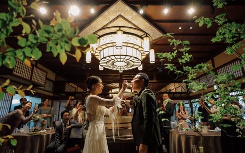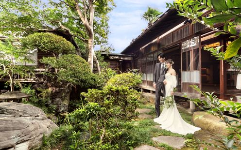 小江戸・川越の街並みにとけこみ、愛されて150年以上。その「料亭 初音屋」のおもかげを宿したまま、「HATSUNEYA GARDEN」はさまざまな目的で集う人びとを迎えてきました。いまの建築ではなし得ない人の手を経た木のぬくもり、繊細なディテール。川越市の文化財にも指定されている贅沢な空間をウェディングでは1日2組限定で全館貸切に。トワイライトタイムからは邸宅内がライトアップされ、より上質な雰囲気が漂います。