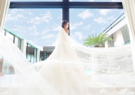 祭壇奥の窓からプールを望み、非日常感を味わえる明るいチャペル。白と木の温もりを活かした空間では天使の羽根が舞い降りるフェザーシャワーや、人気のプラネタリウム演出も愉しめるセレモニーが実現!