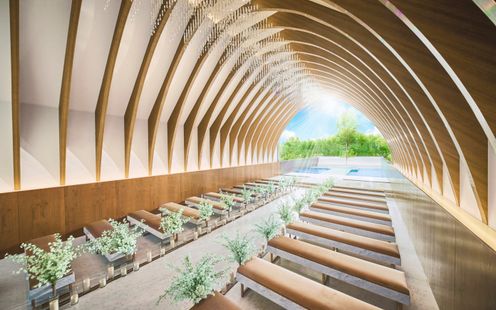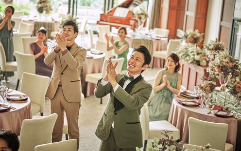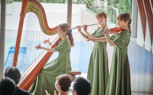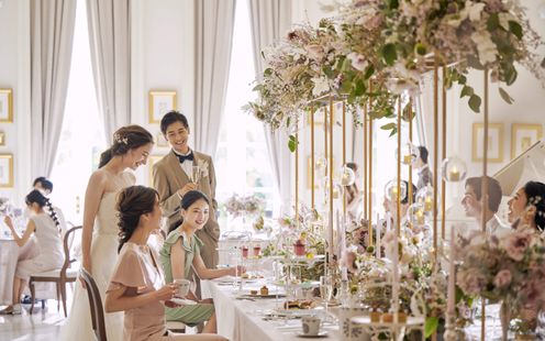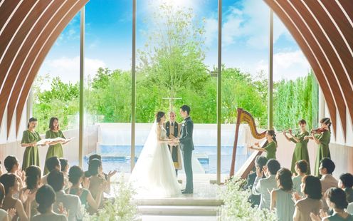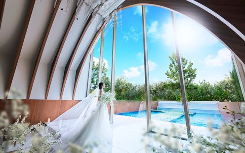 ガラス張りとなる前面には、季節に合わせて色を変える色がどこまでも広がっていき、ふたりを映し出す水鏡で愛を誓いあう姿は心に深く刻まれます。