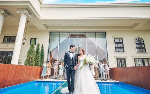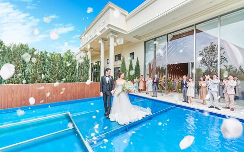 ブーケトスをはじめトレンドのドロップ&フライなど、プールをつかった多彩な演出ができるのが、とても魅力的。