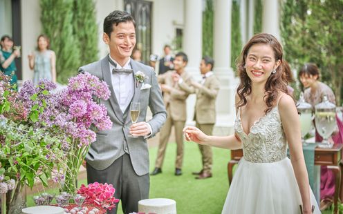 青空の下、肩肘張らない開放的な空間でのパーティはおふたりの緊張もほぐれ、自然とゲストとの会話も弾みます。