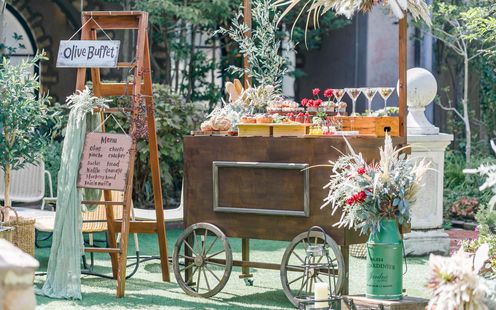 温かみを感じる木の風合いと暖色系の照明により、アットホームな居心地のよい空間が広がる「ヴィラ・ランベルティ」。会場内にはライブキッチンも備え、さらにウォーターガーデンとひと続きなので、パーティ後半はゲストとの交流を愉しめる動きのあるスタイルを取り入れることが可能です。また、ナイトタイムにはキャンドルを灯して幻想的なムードの中、立食形式のカクテルパーティもお愉しみいただけます。