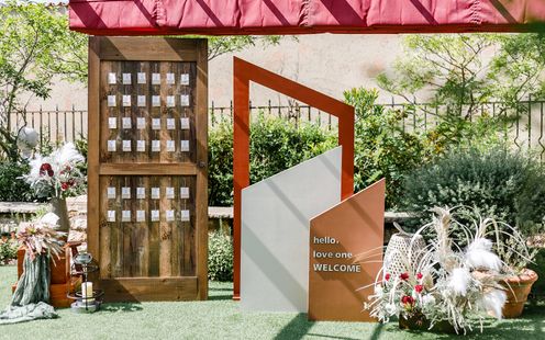 リラックスできるウェイティングラウンジ。ウエルカムドリンクを片手に、心躍るひととき。ふたりならではのアイテムでデコレーションしてゲストをお迎えしてみては。