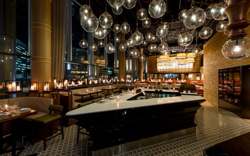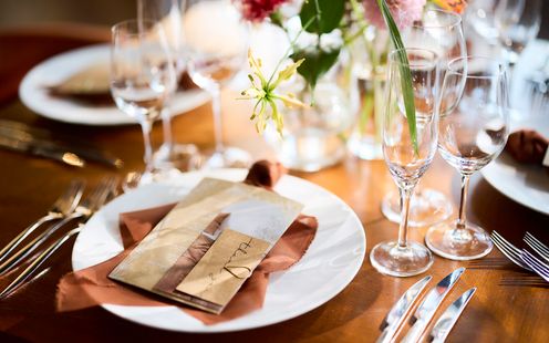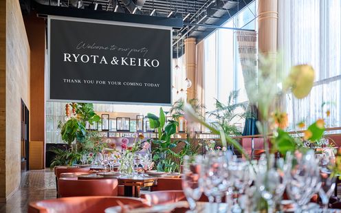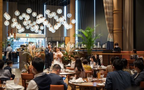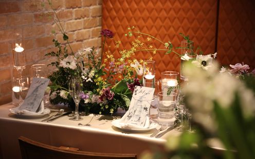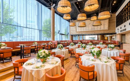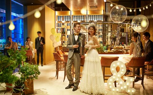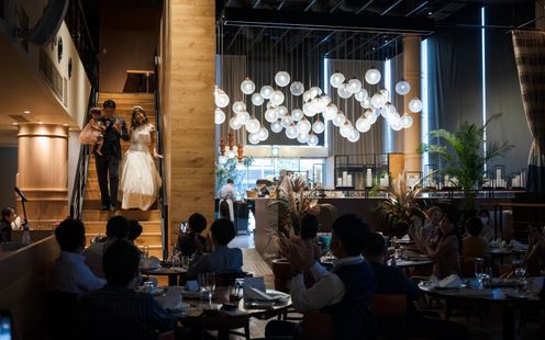 訪れたカップルの多くがひと目惚れする会場は、7mの天井まで届く大きな窓が印象的。新郎新婦の階段入場も叶います。昼は明るい陽光が、夜はリバーサイドの夜景が特別な一日を彩ります。バーカウンターや控室、クロークなど、充実の設備もうれしい限り。レストランをすべて貸切なのでふたりらしい唯一無二の演出をお愉しみいただけます。