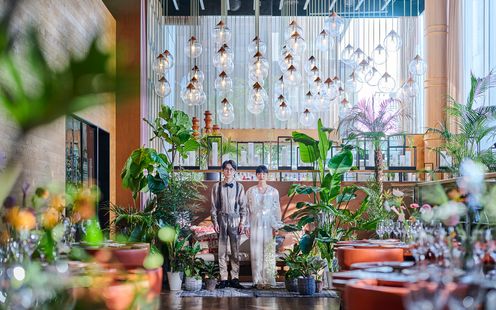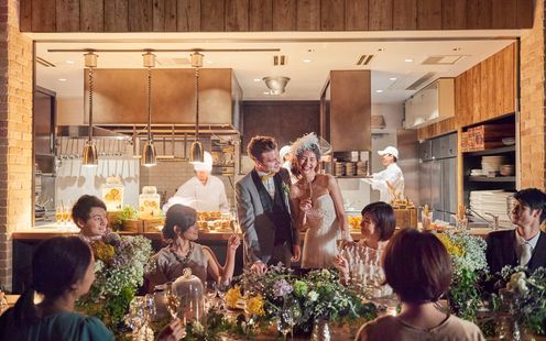 中洲川端駅から徒歩1分。扉の先に広がるのは、吹抜けの天井にシャンパンの泡を思わせるシャンデリアが輝くスタイリッシュな空間。ウエディングプロデュースを行う「ポジティブドリームパーソンズ」が運営するレストランで、こだわりを詰め込んだオシャレなウエディングがかないます。