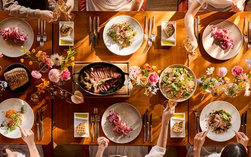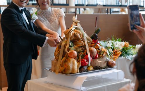 レストランでも高評価の九州産の肉や野菜を炭火でグリルする「American charcoal grill」にてご用意。九州産の野菜や和牛など厳選した素材の旨味を炭火焼で最大限引き出し楽しんでいただけるよう、シェフがその素材に合わせて選んだお料理でご用意いたします。試食では、直接シェフとソースの味の調整など、細かなアレンジまで相談ができます。ブッフェ、各卓に大皿、コースなどスタイルも自由です。新たな世界観を楽しめる料理をご堪能ください。