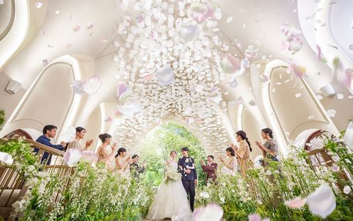 扉を開けた瞬間に目を奪われる幾重もの花びらのオブジェが印象的。祭壇とバージンロードを彩る緑と調和し、自然の中のような挙式を演出。ヴァイオリンの音色が優しく、ゲストとおふたりの幸せをそっと包み込みます。