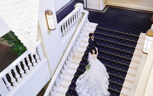 足を踏み入れた瞬間、目に飛び込んでくる3フロア吹き抜けの大階段は圧巻のスケール。挙式後のフラワーシャワーは大切なゲストに囲まれてとびきり幸せな時間に。天候に左右されずにフラワーシャワーや全員での記念撮影などが叶うのも魅力。神前式後のフラワーシャワーも相談可。