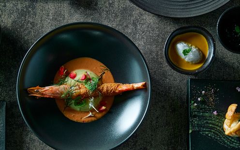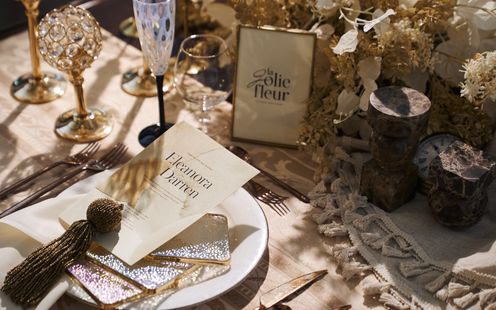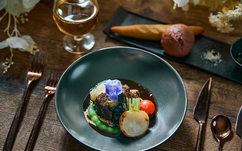 おもてなしの料理は一組ごとに手間隙かけて手掛けるフルオーダーメニュー。「特別な料理でおもてなししたい」「感謝の気持ちを形にしたい」と考えるカップルにおすすめです。料理長はふたりの事前アンケートをもとに、新郎新婦らしさが光るメニューを考案。その後の料理長との打合せでふたりのエピソードや家族との思い出などを丁寧にヒアリングし、メニューをブラッシュアップ。新郎新婦のこれまでの軌跡や思い出が詰まった世界で一つのコース料理が完成します。ふたりからの感謝の気持ちが詰まった数々の料理に、ゲストも喜んでくれるでしょう。また、鳳鳴館で使用しているグラスは、「大正浪漫硝子」。大正時代に盛んだった、あぶり出し技法を用いて復刻した、日本ならではの工芸ガラスです。カトラリーにも大正時代を感じさせる銀食器を使用しており、空間だけでなく手に触れる食器でも大正浪漫を感じていただけます。