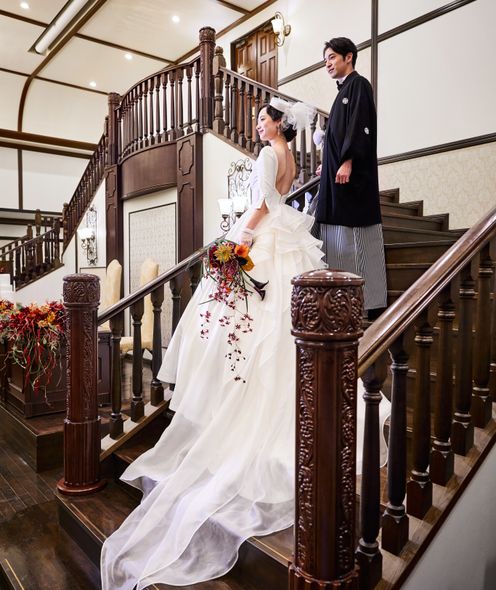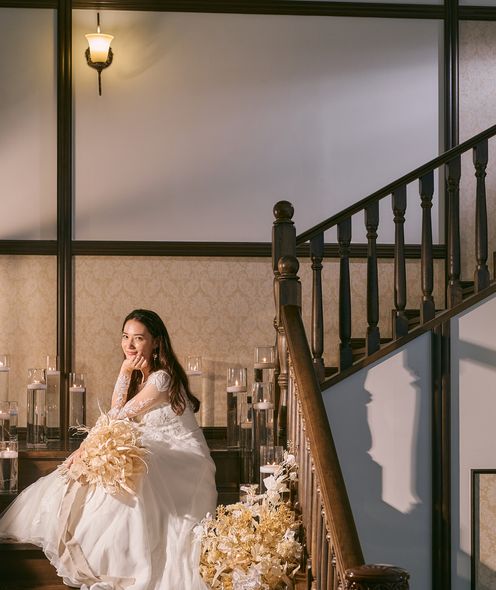 貴族の邸宅をまるごと貸切にできるのでふたりらしい空間演出が楽しめるのも同館の魅力。クラシカルで上品な雰囲気を醸し出すドレスや、大正ロマン感じる和装に似合うコーディネートをお愉しみいただけます。