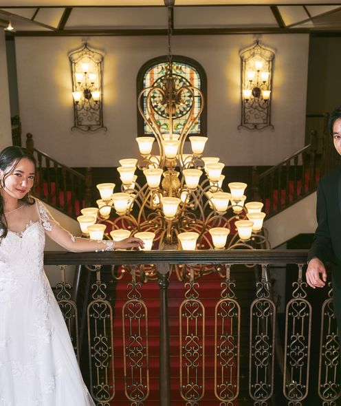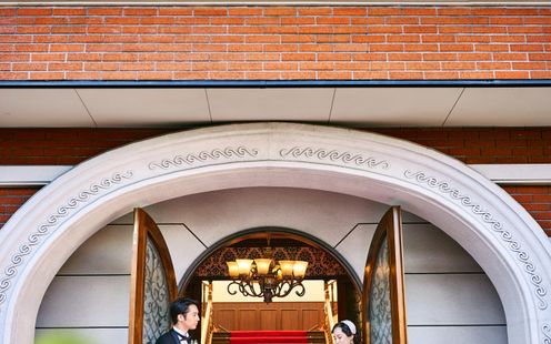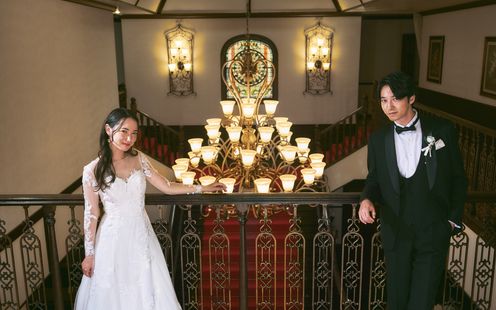 大理石のバージンロードを進んだ先には、繊細なデザインのステンドグラスが優しい輝きを放ちます。大正浪漫の優雅な雰囲気を感じながら、心に残る結婚式が叶えられます。挙式後はエントランスの目の前に一際存在感を放つレッドカーペットの大階段でフラワーシャワーをお愉しみいただけます。