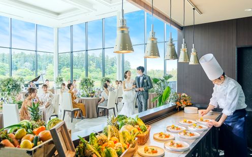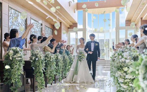 全天候型大階段の先に待っているのは、自然光に彩られたチャペル。天井まで届く大きな窓からは聖なる光が差込み、祭壇奥に流れる滝をキラキラと輝かせ、誓いの舞台をより神秘的に演出します。そして永遠の愛を誓った瞬間、ゆっくりと舞い降りる天使の羽根がふたりを包み込みます。挙式後は温かな祝福を心に刻みながら、全天候型の大階段でフラワーシャワーを。さらに、和装での人前式や、神前式も叶います。