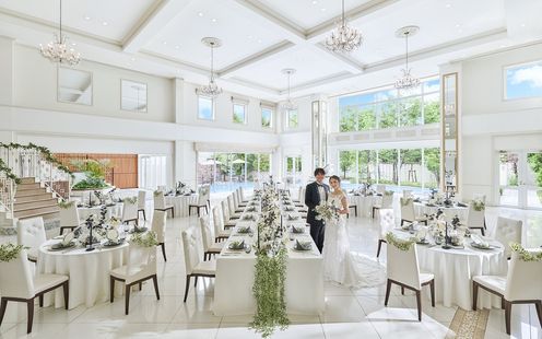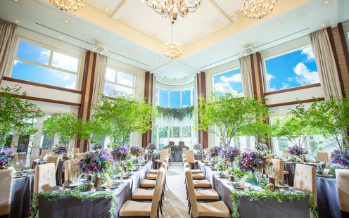 吹抜けの大空間にシャンデリアが輝き、大きな窓からガーデンの眺めと自然光を贅沢に採り込んだ「アルトゥーラ」。2階からスポットライトがあたる中、まるでプリンセスのような階段入場が叶います。LEDビジョンやオープンキッチン付きなのも魅力!さらにガラス張りのインナーガーデンでの生演奏や、プールサイドで乾杯など映画のようなシーンも思いのままに。