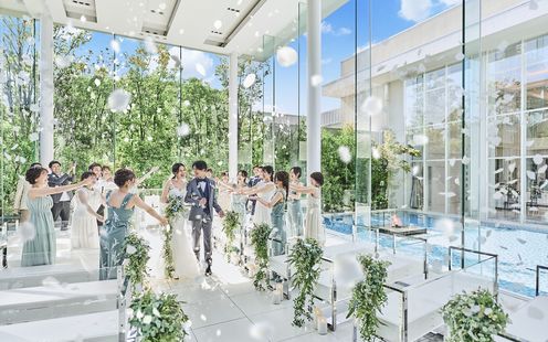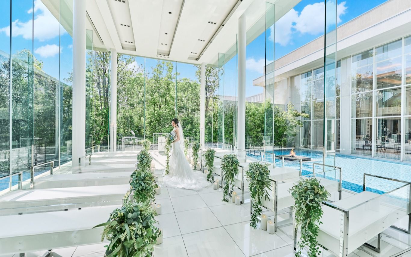 3面をガラス張りの開放感あふれるチャペル「アクアベール教会」。一歩足を踏み入れると、緑・水・光と一体となるような寛ぎに満ちた雰囲気に包まれます。自然光が彩る中で純白のバージンロードを歩む花嫁の姿は美しく輝き、ゲストの心に刻まれるはず。また、宗教色の強くないナチュラルなチャペルなので神前式や人前式もおすすめです。