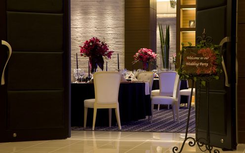 「majestic(荘厳な・魅惑的な)」をコンセプトにデザインされた会場。織物の壁クロスとダークミラーに、間接照明の落ち着いた雰囲気、パープルのカーペットが高貴な印象を与え、静かにそれでいて強い意志を表現いたします。