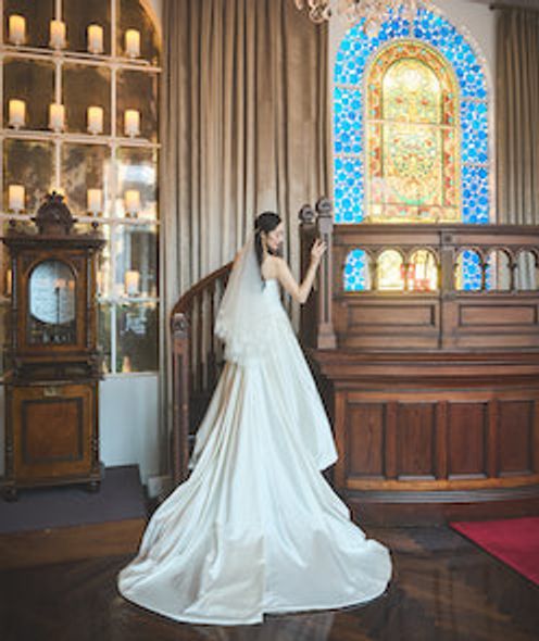 永遠の愛を誓うチャペル「音の教会」は、旧露亜銀行の大広間だった吹き抜けの空間。時の重みを伝える大階段は約100年前の姿をそのまま残し、祭壇や椅子などの調度品は英国の歴史ある教会で使われていたものを移築しました。年月を重ねたステンドグラスの輝き、天窓からやわらかく降り注ぐ自然光、アンティークオルゴールの深みのある音色…大切に守られてきた空間で、光と音楽に祝福される唯一無二のセレモニーが叶います。