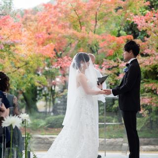 床の反射も綺麗なので、お庭の緑や紅葉がうつり、指輪交換や誓いのキスの写真がより一層映えます!