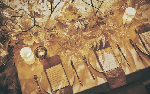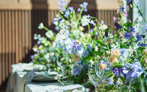 どこにいてもガーデンを望み、自然と一体感を味わえる空間設計。自然光とスタイリッシュな空間を活かしながら、ふたりならではのシーズナルフラワーで彩ります。パーティのコンセプトやブライズルックを引き立てる、ふたりだけのフラワーアレンジをコーディネーターがご提案。大切なゲストが過ごすテーブルにも、ふたりらしいおもてなしをちりばめて。オリジナルコンセプトに基づいたペーパーアイテムやコーディネートを多岐にわたり紹介いたします!