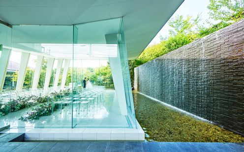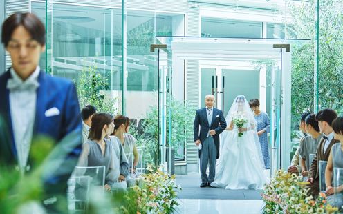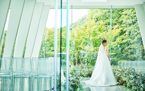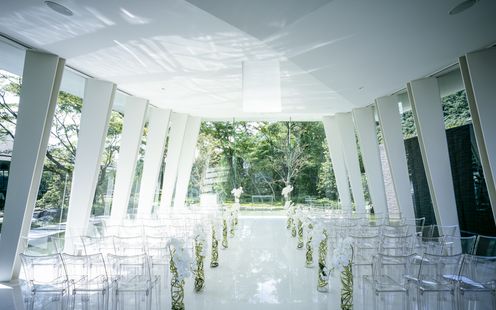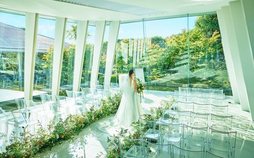 ガラス張りの透明感あふれるチャペル。庭園や水面の煌めきがバージンロードを歩むふたりを祝福