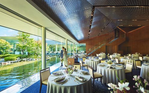 窓からは庭園と水面の揺らめきが見え、特別な時を優しく包み、 誰もが息を呑むほどに感動的なセレモニーを演出します。シンプルモダンなチャペルだからこそ、 ふたりならではの空気感が自然にゲストに伝わりやすい挙式が叶います。※着席80名まで