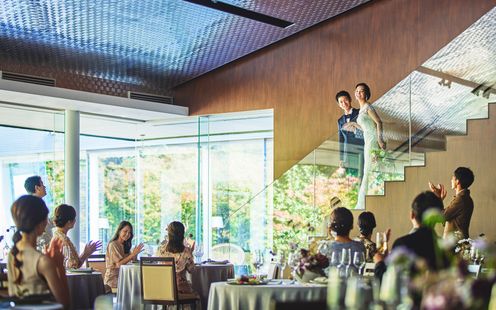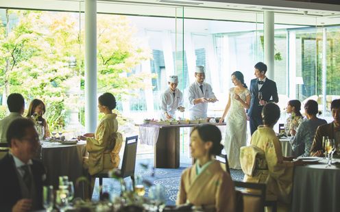 ガラスウォールの外に広がる四季折々の豊かな自然が格別の開放感を与えるメインダイニングで京の風情を感じるウエディングを。1組貸切だからラウンジでゲストとの交流を大切にした寛ぎの時間から、緑豊かなガーデンでのサプライズシーンまでパーティ演出は自由自在!天井高は7mにおよぶ開放感あふれる空間でのパーティは、大勢のゲストに見守られる憧れの階段入場や、オープンキッチンから出来立て熱々の料理をサーブしたり、ライブキッチンでの料理パフォーマンスも叶います。また、隣接するガーデンへ自由に行き来してゲスト同士もリラックスできるおもてなし演出をお楽しみください。