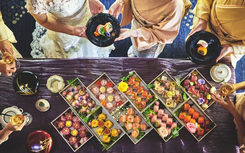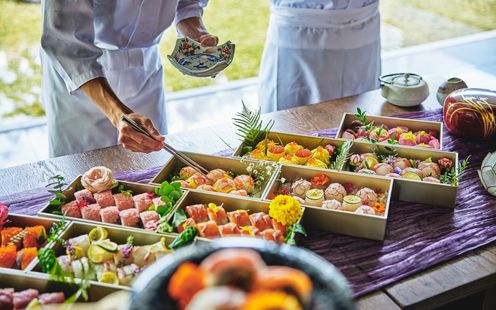 こだわりの器に美しく季節の訪れを閉じ込めた、京のおもてなしにふさわしい料理は、京野菜をはじめ、こだわりの食材を、匠の技で仕上げております。デザイナーとコラボした盛り付けは、目にも美しく、五感を刺激する記憶に残る一皿にし、陽光と木々の緑、水景を目前にした開放感あふれる空間にふさわしい、四季のある美食でおもてなしをいたします。