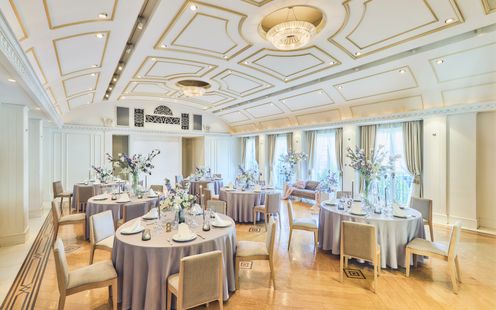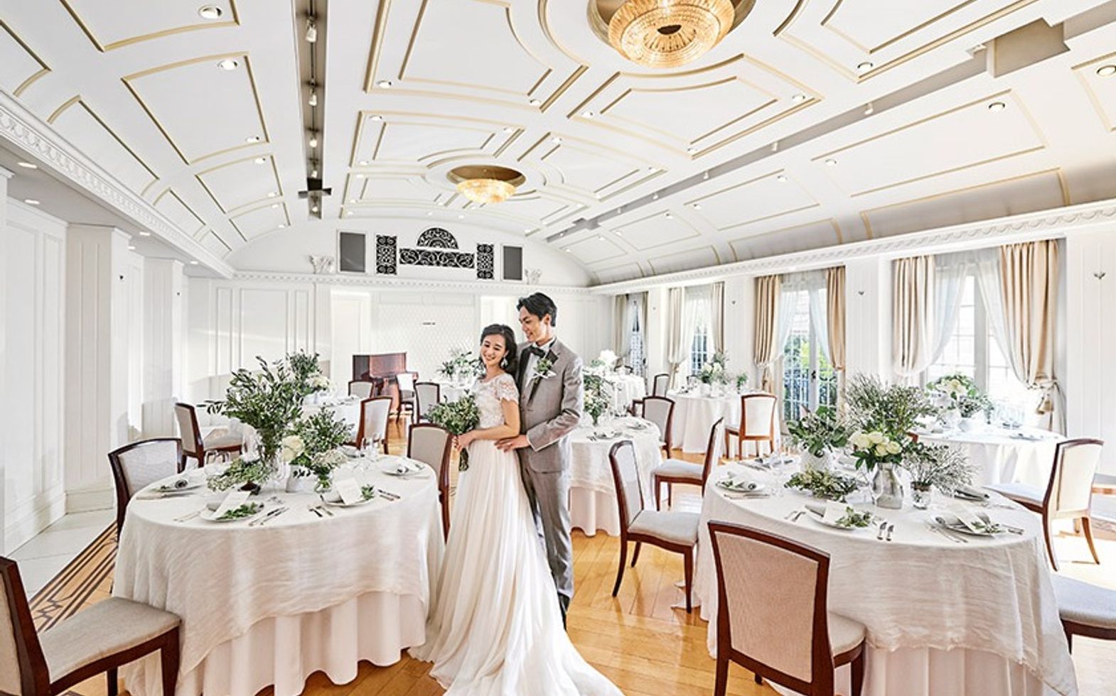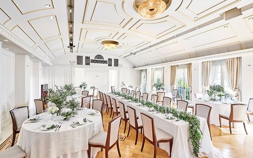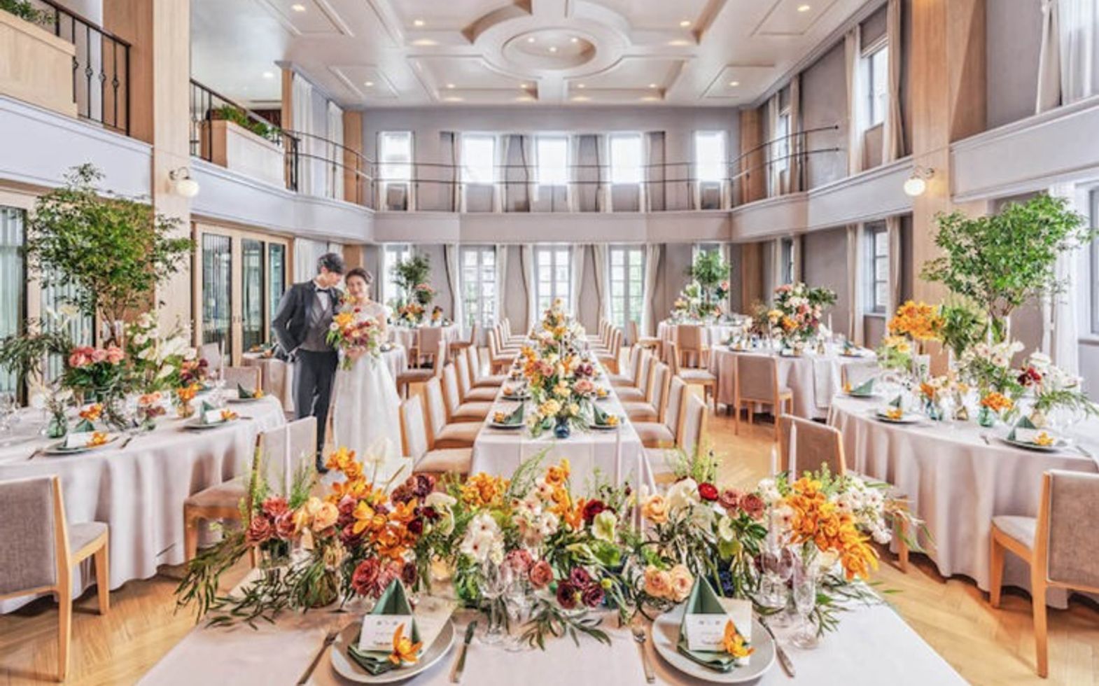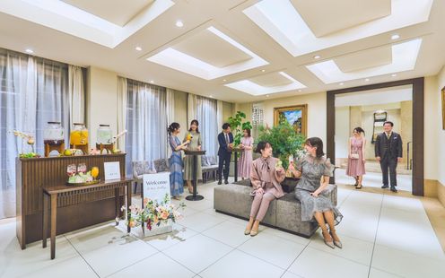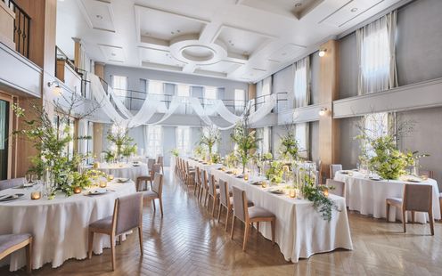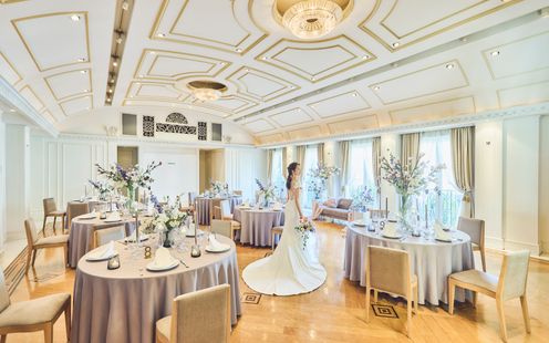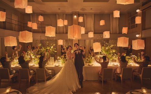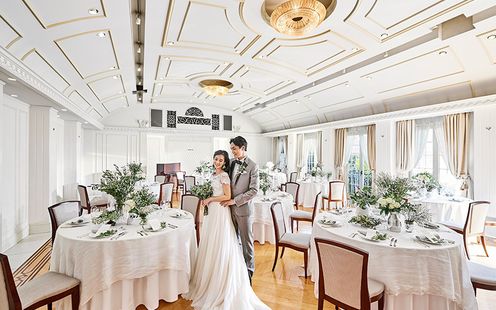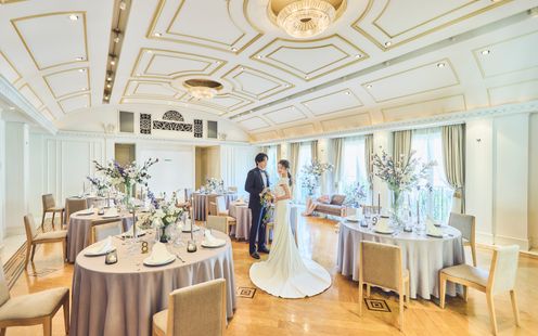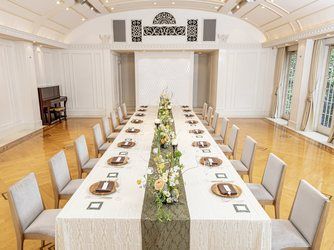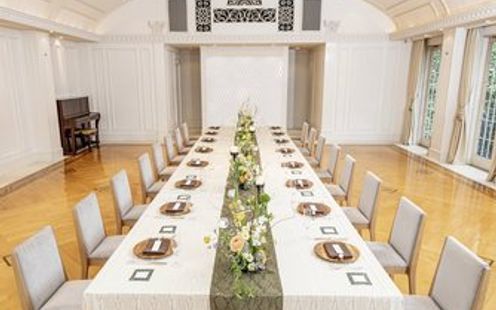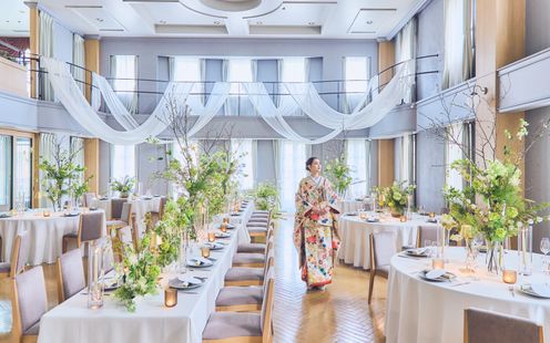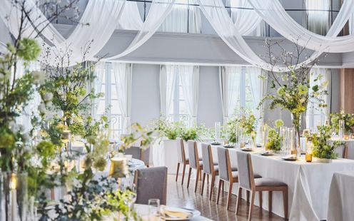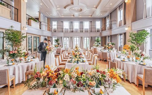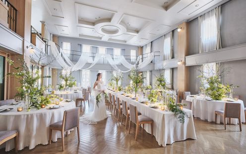 エレガントなインテリアが迎賓館を思わせる、贅沢なパーティ空間。コーディネート次第でナチュラルな洗練された雰囲気に包まれます。吹き抜けの開放感あふれる会場でアットホームなひとときを。