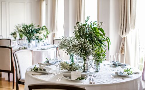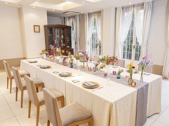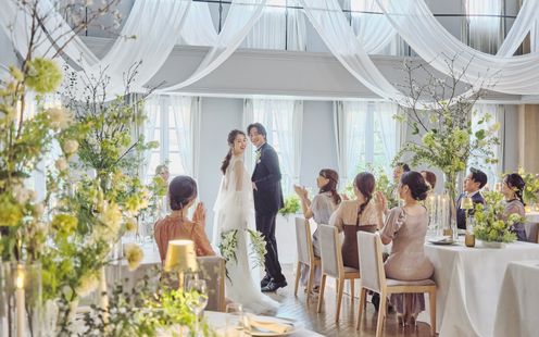 【THE TRINITY HOUSE 1F】は家族だけの結婚式を希望するふたりにおすすめ!気心のしれた家族・親族・親友と一つのテーブルをみんなで囲み、美食とともに会話を楽しむスタイル。自然光に包まれながら和やかなひとときをお過ごしいただけます。