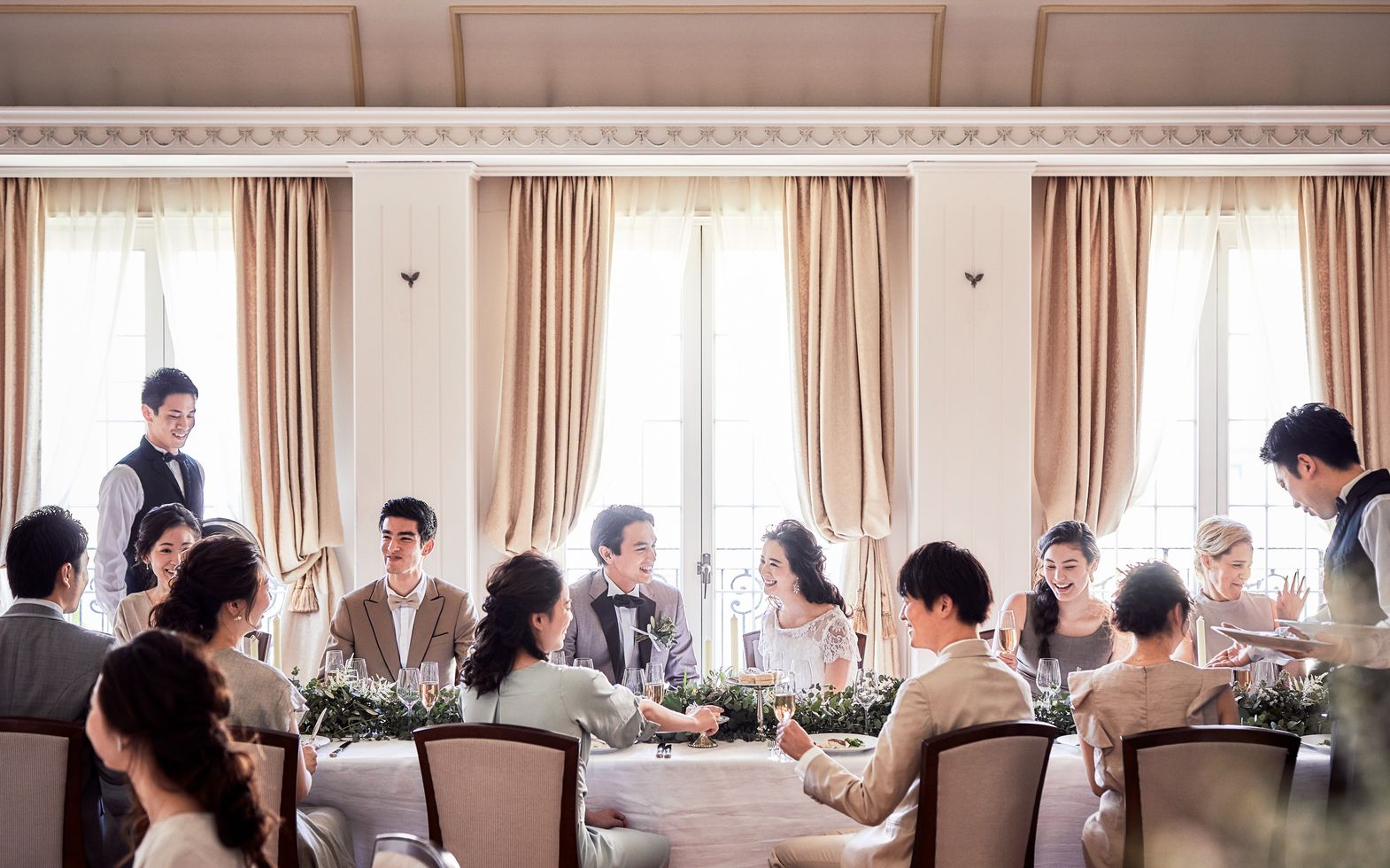 クラシカルな雰囲気が漂う上質な空間【THE TRINITY HOUSE】。 陽の光が窓から差し込む、開放的なパーティ会場では、ふたりのご希望スタイルに合わせて自由にレイアウト変更が可能です。ゲストとも距離の近い、アットホームなパーティを叶います。