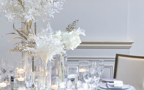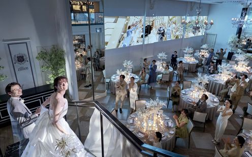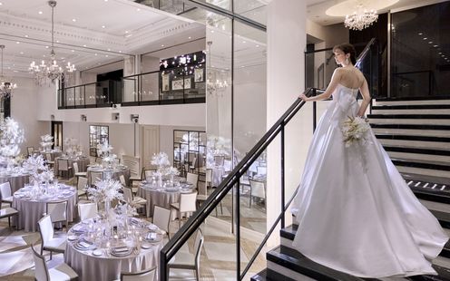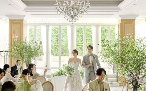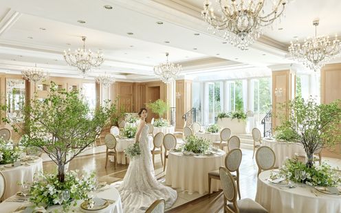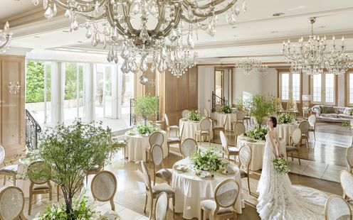 王道クラシカルでありながら、コンサバトリーとつながったガーデンも併設。表参道という好立地にもかかわらず専用のプライベートガーデンで、明るい陽光に包まれたゆったりとした時間が流れる。会場内に飾られた調度品やエルメスのビンテージプレートで晴れの日にふさわしい特別感溢れるご披露宴会場。