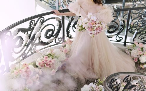 螺旋階段から優雅に登場し、花嫁の理想を詰め込んだ邸宅で、憧れの夢を叶えて。クラシックな内装に、花嫁らしい華やかなシャンデリアやデコレーションがアクセントに。ロマンティックな螺旋階段や調度品でまとめられた内観は、ウエディングドレスの花嫁をより一層輝かせます。