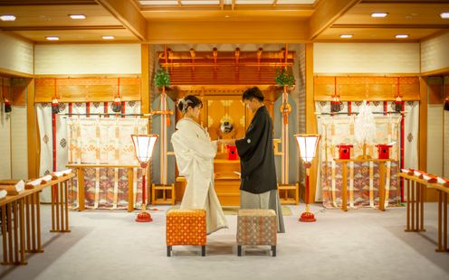 なじみ深い加藤清正公の御霊を祀る本格的な神殿で、熊本ならではの格式ある神前式が執り行えます。両家が向かい合い、絆を結ぶ伝統の儀式は心に深く残る厳粛なひとときに。白無垢の花嫁と両親の姿が、歴史とともに受け継がれてきた美しい時間を紡ぎます。