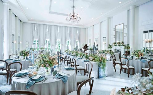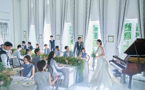 天井が高く開放的で、窓からの光と緑が寛ぎ溢れる空間を演出。自然と会話が弾む和やかな雰囲気のパーティが繰り広げられます。ふたりのウェディングのテーマにあわせてテーブルレイアウトや演出も自由自在。シェフによるフランベ演出がパーティを盛り上げるライブキッチンをはじめ、プール付きガーデンでのデザートビュッフェ&フィンガーフードのアレンジなど、ふたりのアイデア次第でゲストへのおもてなしもオリジナリティ豊かなスタイルが叶います。